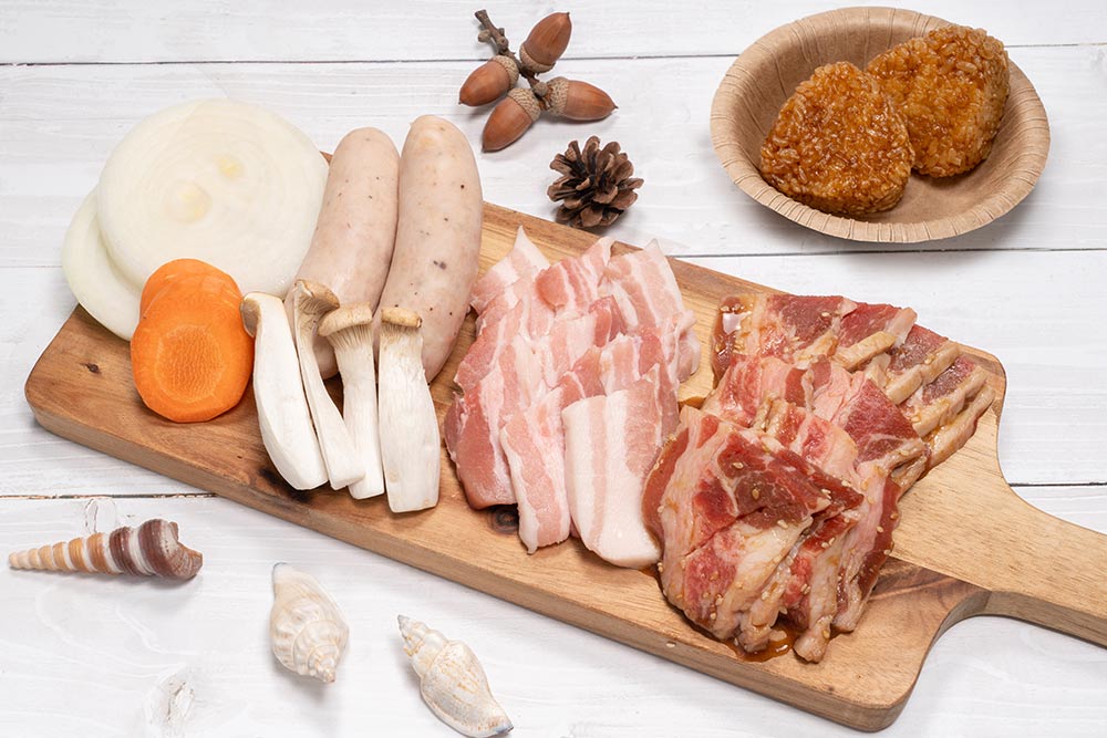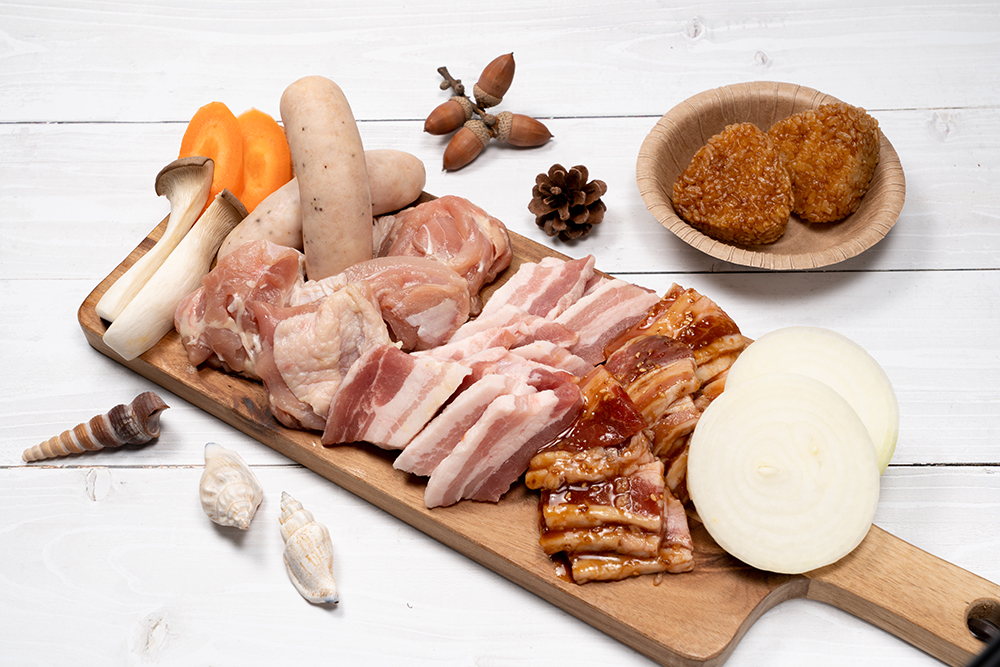 食欲をそそる厚切り豚カルビに、ガーリック風味の鶏モモ肉。お手頃価格のBBQセット!